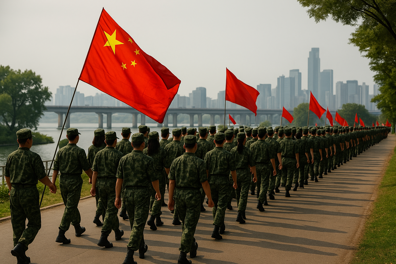 서울 한강공원에서 중국인 단체가 군복처럼 보이는 복장을 입고 군대식으로 행진하는 영상이 퍼지며 논란이 커지고 있습니다. 영상은 최근 각종 온라인 커뮤니티와 SNS를 통해 확산되었고, 참가자들이 붉은 깃발을 들고 오와 열을 맞춰 걷는 모습이 마치 군사 퍼레이드처럼 보였다는 반응이 이어지고 있습니다. 이 영상은 지난 10월 31일 여의도 한강공원 물빛무대 인근에서 촬영된 것으로 추정되며, 약 100명가량의 중국인이 참여한 행사였습니다. 현장에는 중국 국기를 연상시키는 붉은 깃발이 휘날렸고, 일부 참가자들은 군복 무늬의 상하의와 모자를 착용한 채 정렬된 동작으로 행진했습니다.
