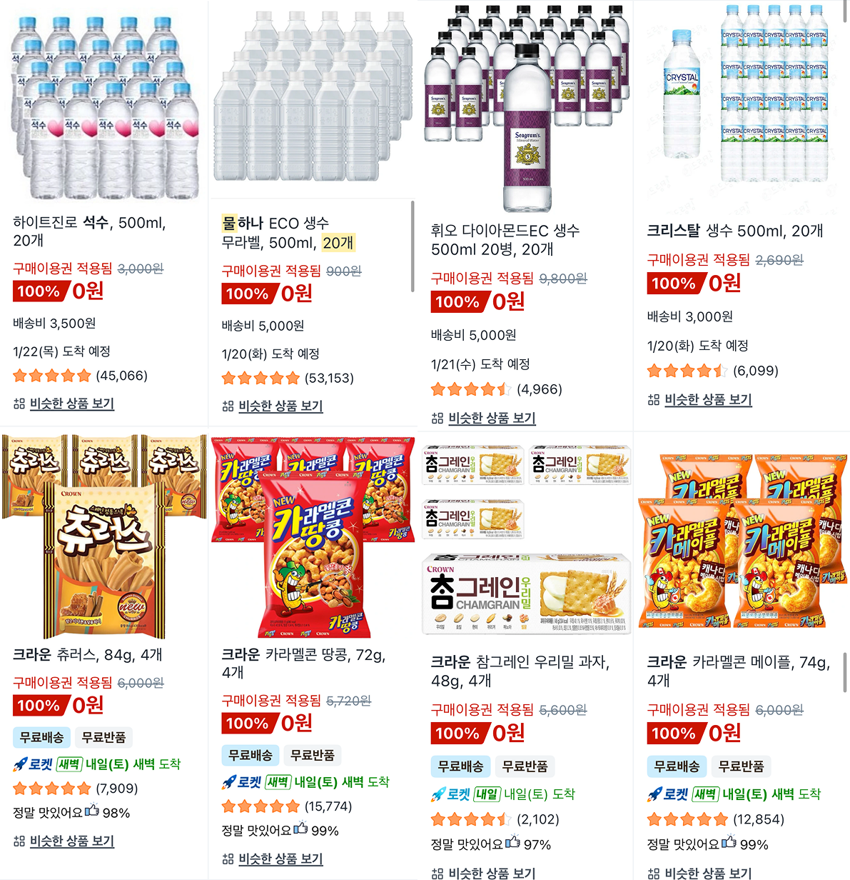 로켓배송·로켓프레시에서는 휴지, 물티슈, 생수, 라면, 식빵 같은 생필품이 이용권 자동 적용으로 0원 또는 수백 원대에 결제되는 사례가 잇따랐다.