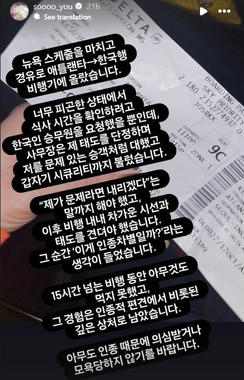 소유는 뉴욕 일정을 마치고 애틀랜타를 경유해 한국행 델타항공 비행기에 탑승했다. 그녀는 자신의 SNS에 탑승권 사진과 함께 “너무 피곤한 상태에서 식사 시간을 물어보려고 한국인 승무원을 찾았을 뿐인데, 태도를 문제 삼으며 시큐리티를 불렀다”고 주장했다. 이어 “내가 문제라면 내리겠다”고까지 말했다며, 이후 비행 내내 차가운 시선을 받았다고 토로했다. 그는 15시간이 넘는 비행 동안 아무것도 먹지 못했다고 밝혔고, 그 순간 “이게 인종차별일까?”라는 생각이 들었다고 말했다. 이 글은 순식간에 온라인에서 퍼졌고,